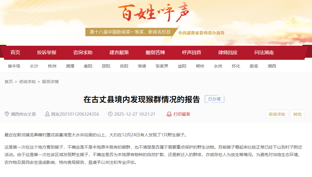 近日,有网友在红网《百姓呼声》栏目反映,在湘西州古丈县默戎镇龙鼻嘴村附近山上发现野生猴子活动。