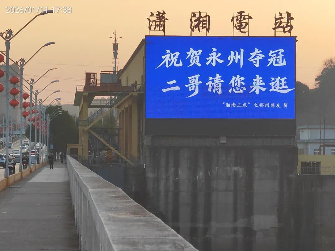 1月11日,“祝贺永州夺冠 二哥请您来逛——‘湘南三虎’之郴州网友贺”巨幅标语同步登上永州、郴州城区的户外大屏。