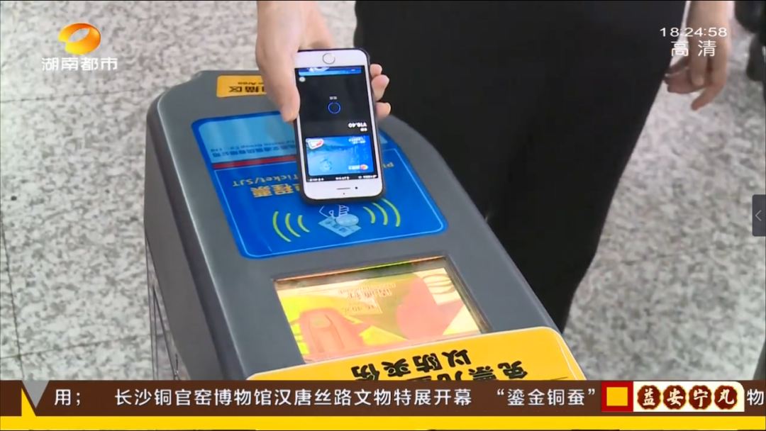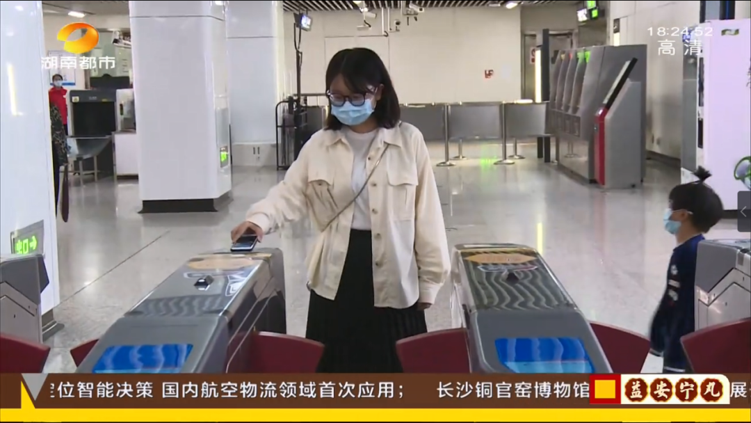 记者现在来到的是袁家岭地铁站,我手上拿的是一部已经绑定好潇湘卡的苹果手机,据说它在黑屏的情况下也可以进行支付,我现在来体验一下。可以看到我非常快速的通过了这个关卡,非常方便。