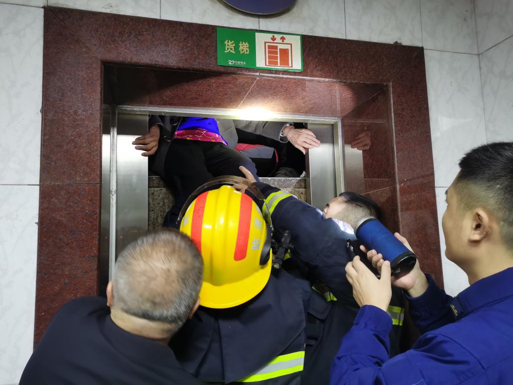 撬开电梯轿厢后,指战员按照妇女儿童优先原则先后将 9 名被困人员抱出,电梯内人数减至额定人数后,由该大厦工程部人员操作电梯将电梯调至电梯口,剩余被困人员顺利走出电梯。