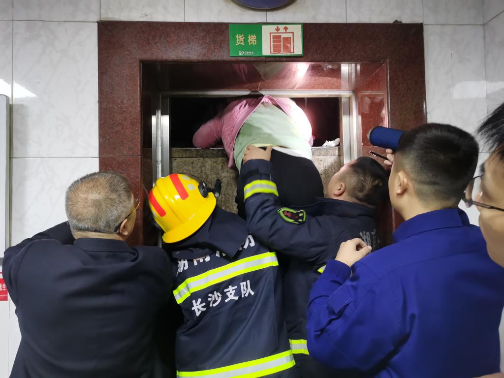 10 月 16 日 9 点 6 分,长沙消防指挥中心接到报警:位于芙蓉中路华菱大厦有人被困电梯,遂迅速调派定王台消防站一台水罐车、7 名指战员赶赴现场营救。