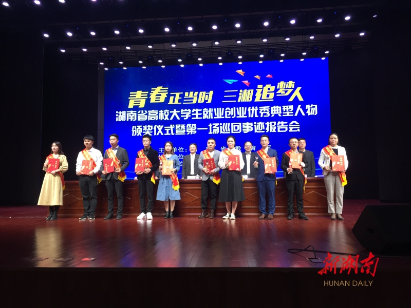 湖南日报·新湖南客户端10月26日讯(记者 易禹琳)为鼓励大学生基层就业和创新创业,今天上午,由省教育厅主办的“青春正当时 三湘追梦人”湖南省高校大学生就业创业优秀典型人物颁奖仪式暨第一场巡回事迹报告会在长沙学院举行。湖南农业大学莫博程等20人获表彰。其中中南大学易跃能等5人分享了自己的就业创业故事。