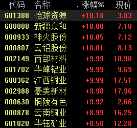 周一盘中,有色金属板块持续走强,截至午间收盘,怡球资源、火神股份、云铝股份、华峰铝业等多股涨停,云南铜业、明泰铝业和等纷纷跟涨。