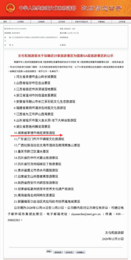 凤凰网湖南讯(通讯员 吴京文)12月25日,中华人民共和国文化和旅游部公示期满,湖南省常德市桃花源旅游区成功晋升国家5A级旅游景区。