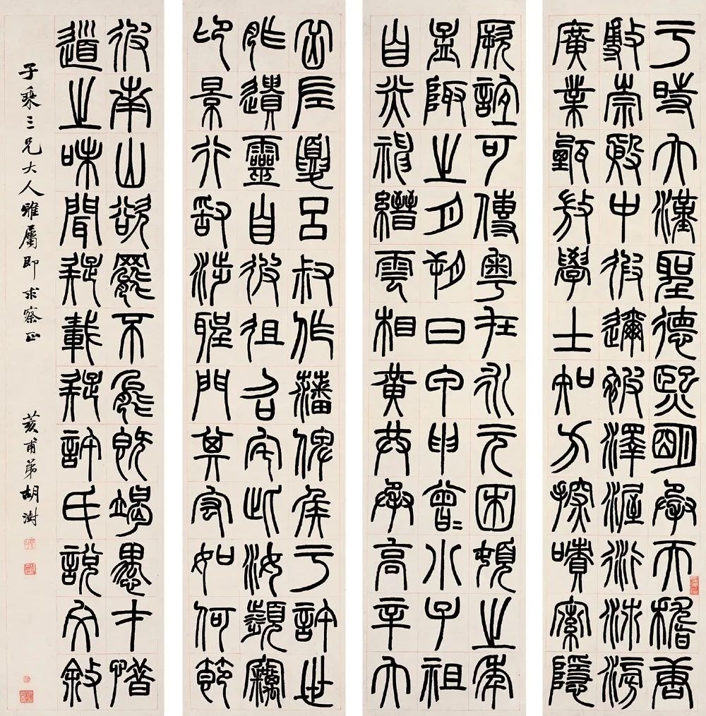 赵之谦十分推崇和敬佩胡澍所作的篆书,说胡澍的篆书是继邓石如之后,与吴让之同为突出的,并称“荄甫尚在,吾不敢作篆书”