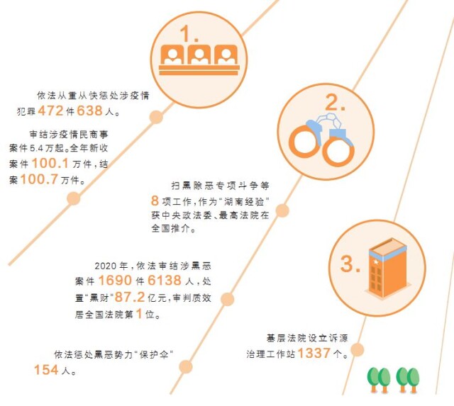 2020年,湖南法院一手抓疫情防控、一手抓办案,依法从重从快惩处涉疫情犯罪472件638人,审结涉疫民商事案件5.4万起。全年新收案件100.1万件,结案100.7万件。