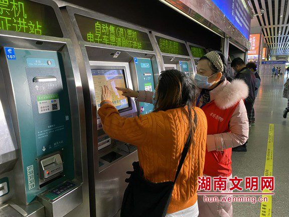 ▲“复兴号”高铁志愿联盟志愿者高慧明指导旅客购票。图片来源:湖南文明网