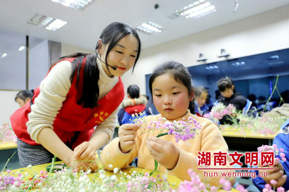 ▲插花课上,衡阳技师学院志愿者谢老师指导金月完小留守儿童杨文倩制作花环,文倩说要把花环送给自己最敬爱的班主任尹老师。图片来源:湖南文明网