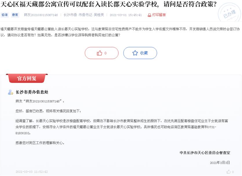 3 月 1 日,有市民咨询天心区福天藏郡公寓宣传可以配套入读长郡天心实验学校是否符合政策的问题。