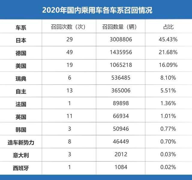 整理 2020 年召回数据显示,日系品牌 2020 年累计召回 3008806 辆车,占据全年召回总量 45.43%;包含 BBA 在内的德系品牌累计发布 49 次召回公告,共召回 1435956 辆,其中奔驰和宝马是榜单中召回次数超过 10 次的品牌;美系品牌共召回汽车 1065218 辆,占比 16.09%;自主品牌共发起 13 次召回,累计召回 365006 辆,法系、韩系等其他品牌召回的占比不足 4%。