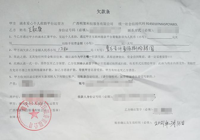 记者注意到,该欠款单上甲方的落款是 " 滴水爱心个人救助平台运营方广西明策科技服务有限公司 "。这与聘用小沈的广西央槐科技有限公司,并不一致。