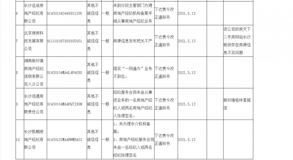 此外,长沙市住建局还曝光了 1 家房地产网络平台公司和 4 家房地产经纪机构。北京搜房科技发展有限公司旗下的房天下二手房网站长沙板块存在房源信息不实问题;长沙远途房地产经纪有限公司未到行政主管部门办理房地产经纪机构备案手续从事房地产经纪业务;湖南新环境房地产经纪连锁有限公司八分公司落实 " 一网通办 " 业务不到位;长沙佰遇房地产经纪有限责任公司(新环境格林星城店)存在经纪服务合同未由从事该业务的一名房地产经纪人或两名房地产经纪人协理签名的问题;长沙凯朝房地产经纪有限公司未办理中介机构备案,且房地产经纪服务合同未由一名经纪人或两名经纪协理签名。