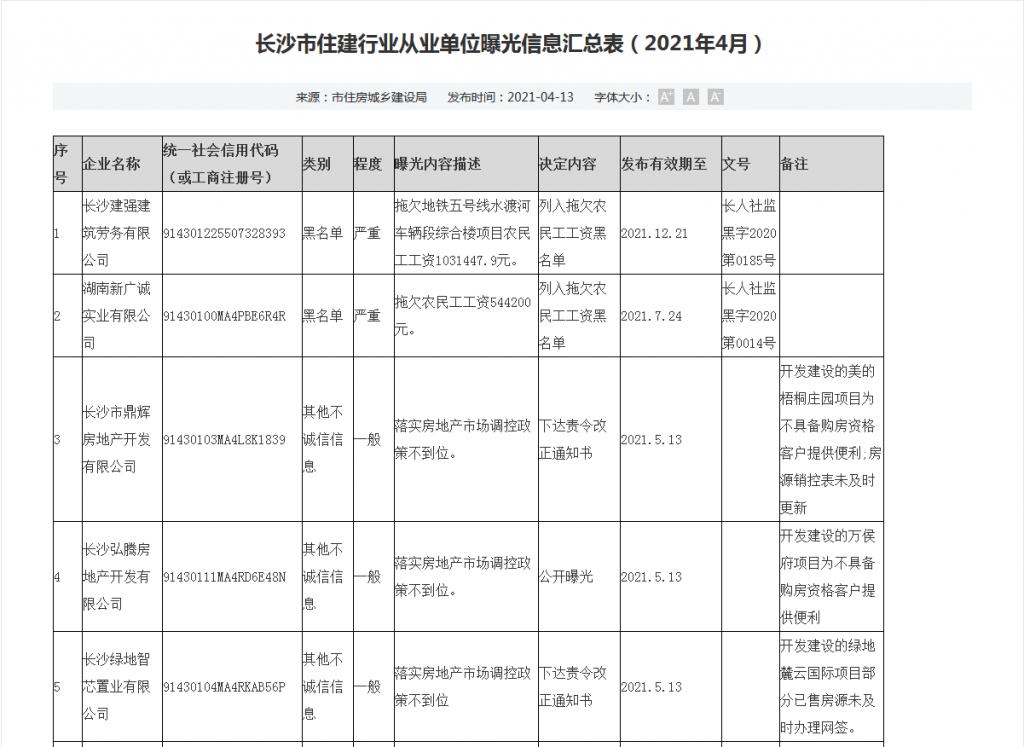 4 月 13 日,长沙市住建局曝光了一批 4 月长沙市住建领域不诚信企业名单。其中,长沙建强建筑劳务有限公司拖欠地铁 5 号线水渡河车辆段综合楼项目农民工工资 103.14 万元,湖南新广诚实业有限公司拖欠农民工工资 54.42 万元,这 2 家企业被列入拖欠农民工工资 " 黑名单 "。