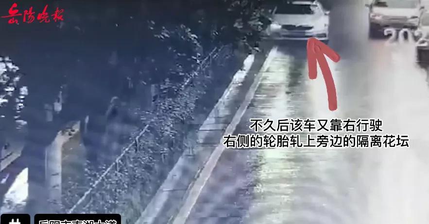 不久后,该车又靠右行驶,右侧的轮胎轧上旁边的隔离花坛,行驶了十几米后回归路面,在红绿灯路口不按规定路线行驶,径直开向了南湖广场,直到撞到隔离柱后才停了下来。