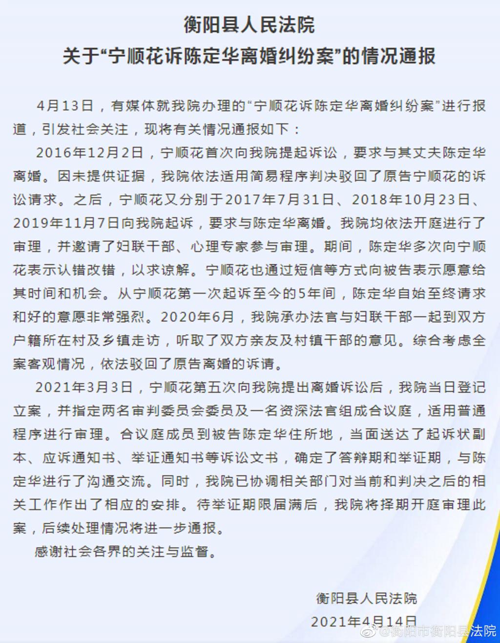 4 月 13 日,有媒体就我院办理的 " 宁顺花诉陈定华离婚纠纷案 " 进行报道,引发社会关注,现将有关情况通报如下: