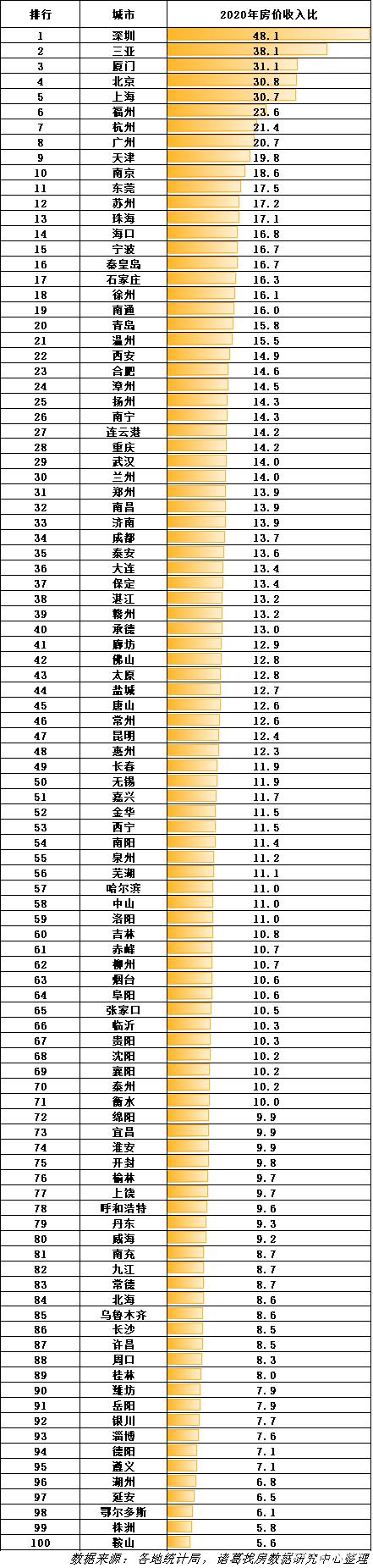 据诸葛找房数据研究中心发布了百城房价收入比数据,2020年百城房价收入比整体达13.2,其中深圳以48.1的房价收入比高居首位,紧随其后的是三亚、厦门和北京。其中,长沙2020年房价收入比为8.5,百城中排名第86,在省会城市中仅高于银川,排行倒数第二。