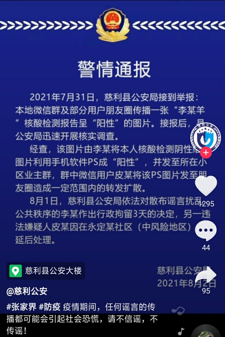 本报讯 8月2日,张家界慈利公安发布警情通报:7月31日,慈利县公安局接到举报:本地微信群及部分用户朋友圈传播一张“李某羊”核酸检报告呈“阳性”的图片。接报后,县公安局迅速开展核实调查。