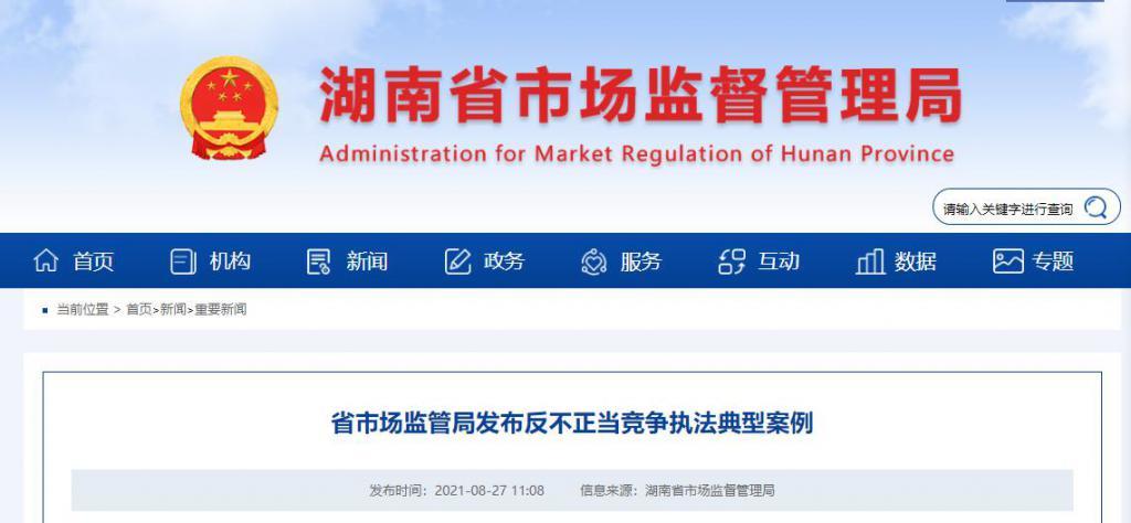 8 月 27 日,湖南省市场监管局在官网发布反不正当竞争执法典型案例。今年以来,湖南省市场监管部门聚焦人民群众高度关注的食品、课外培训等重点领域,在全省开展反不正当竞争执法专项行动,依法查处混淆、商业贿赂、虚假宣传和违法有奖销售等不正当竞争行为,公布一批执法案例。下阶段,全省市场监管部门将继续按优化营商环境要求,持续整治互联网、医药购销、医疗美容、校外培训机构等领域违规商业炒作、违法促销、商业贿赂等不正当竞争行为,切实维护消费者合法权益。