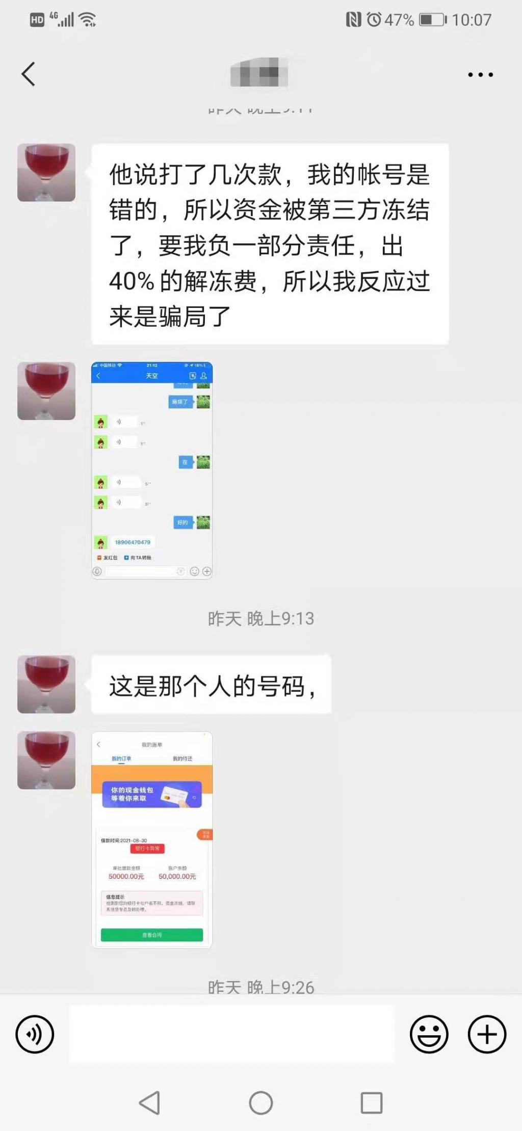 同时对方提出,由于刘女士的失误导致账号被冻结,刘女士必须要负一部分责任,按照规定需要支付 40% 的解冻费,刘女士借款五万元钱,折算后刚好是两万元解冻费。如果不按照要求支付,将要向公安机关报案,还要向司法机关提起诉讼,影响刘女士的个人征信。