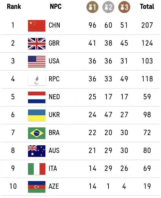 当地时间5日下午,东京残奥会赛事全部结束。中国代表团以96金60银51铜共207枚奖牌,在金牌和奖牌双榜遥遥领先,实现了从2004年雅典残奥会至今的残奥会金牌和奖牌五连冠。