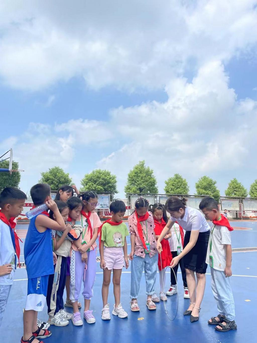 妹妹彭文雅带领学生滚铁环。