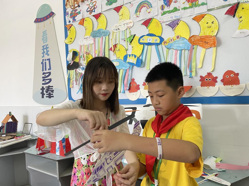 姐姐彭文静指导学生制作航模。