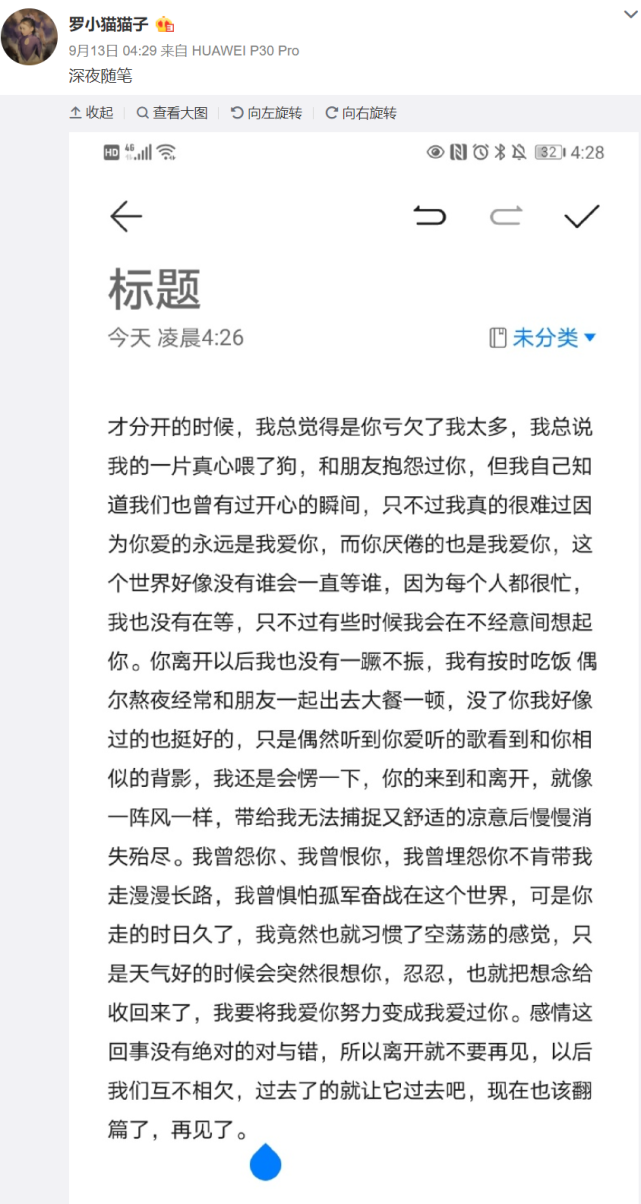 其微博中,上个月13号还发布了一条文字截图,显示她为情所困。但文字最后,她也写道:“过去的就让它过去吧,现在也该翻篇了,再见了”,只是,她最终却没能真正走出抑郁症的漩涡。