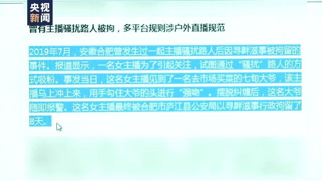 近年来,有关户外主播偷拍、搭讪骚扰路人引发案件纠纷的情况时有发生。2019年7月,安徽合肥一名女主播为了引起关注,试图通过“骚扰”路人的方式吸粉。该女主播最终被公安机关以寻衅滋事行政拘留8天;2020年9月,某网络男主播在街头直播搭讪,向多名女子求吻,甚至尾随一名醉酒女子而遭到网友举报。随后平台将其账号永久封禁,并上报互联网主播黑名单。
