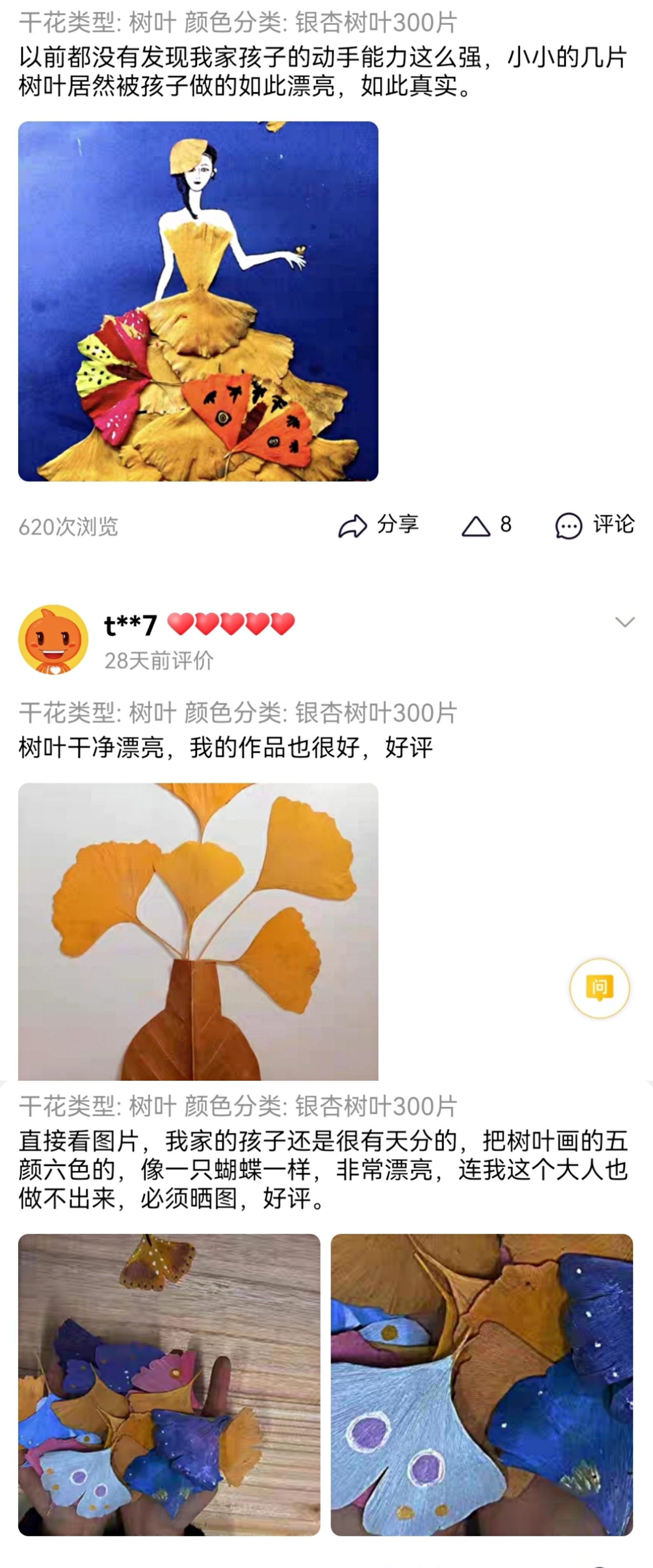 20片银杏叶售价10元,300片银杏叶售价100,1000片银杏叶售价193元,4000片银杏叶售价207元……点开专门售卖银杏叶标本的商铺,评论区里,网友们表达了对于这种销售方式的感慨以及自己没有这种商业头脑的遗憾。记者看到,许多买家会将买来的银杏叶作为和孩子互动的礼物:共同在银杏叶上绘画或者利用银杏叶做手工。