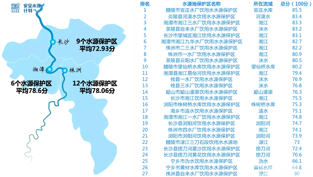 排名首位的水源地均在株洲地区,即醴陵市官庄水厂饮用水水源地得85.5分排名第一,株洲县自来水厂饮用水水源地得60分排名倒数第一。