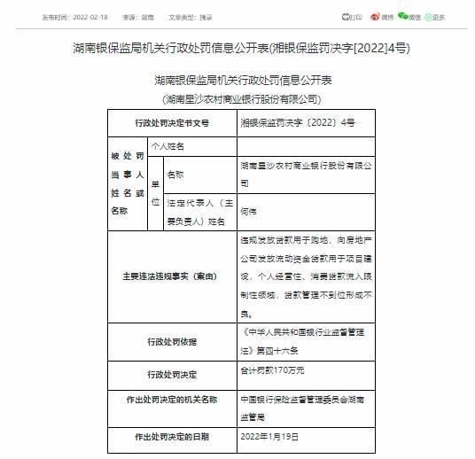 2月18日,银保监会官网披露的一则行政处罚公开信息表显示,湖南星沙农村商业银行股份有限公司因多项违法违规行为被罚款170万元。