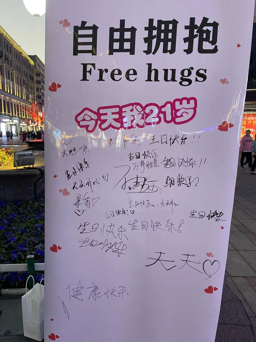 3 月 8 日晚 6 点,常德步行街站着一位穿着白色卫衣的女孩,她的身边立着一个易拉宝,上面写着 " 自由拥抱,今天我 21 岁 "。这名常德女孩李璐(化名)想用这种方式庆祝自己的 21 岁生日,和陌生人双向传递善意与温暖。