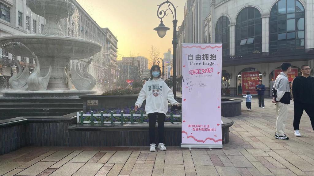 步行街上人流如织,路人步履匆匆,李璐紧张又忐忑地等待着她的第一个拥抱,十几分钟后,一位穿着红色衣服的女孩站定,看了看李璐和她身边的易拉宝,走上前去紧紧地拥抱了她,女孩的手臂接触到她后背的一刹那,她差点激动得掉眼泪。李璐告诉记者,她感受到一种从未有过的陌生但充满善意的温暖。
