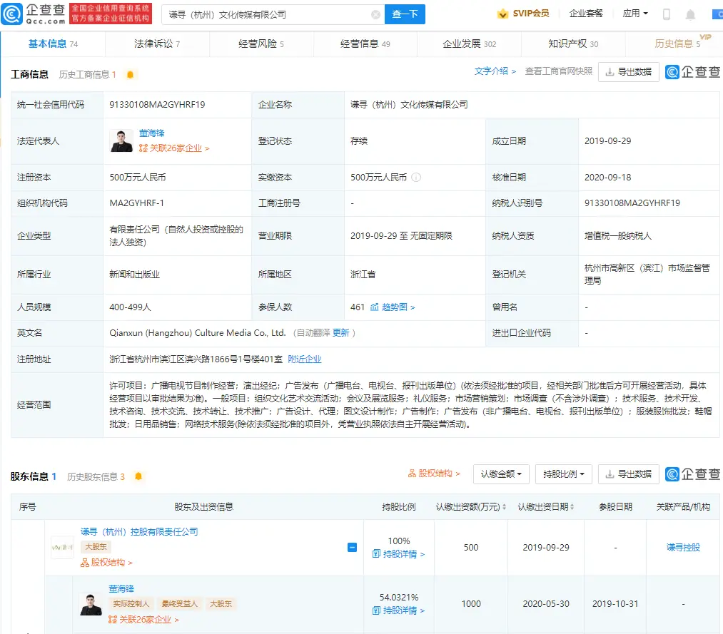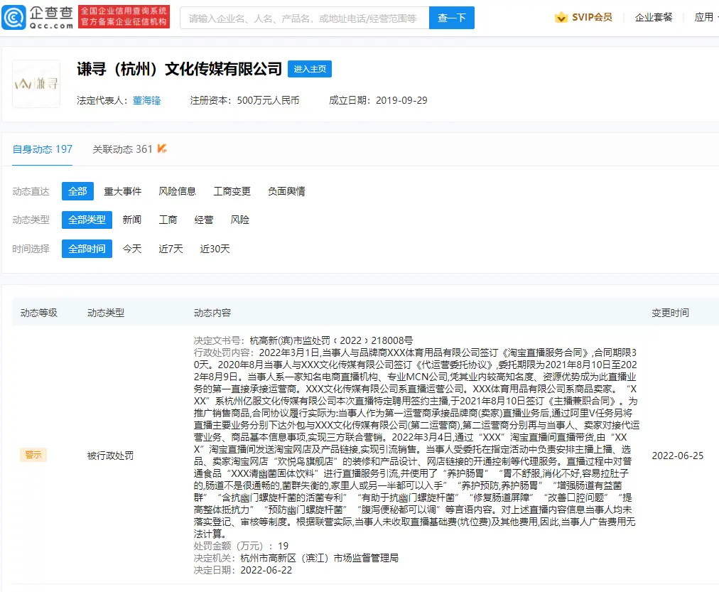 6月27日,谦寻(杭州)文化传媒有限公司因违反广告法,被杭州市高新区(滨江)市场监督管理局罚款19万元。处罚事由显示,3月4日,当事人受委托在指定活动中负责安排主播上播、选品、某网店的装修和产品设计、网店链接的开通控制等代理服务。