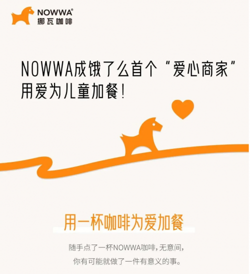 在业绩亮眼的同时,NOWWA挪瓦咖啡在社会责任方面也迈出了坚定的一步。11月10日,NOWWA挪瓦咖啡成为饿了么首个“爱心商家”,这意味着接下来一年内,消费者通过饿了么平台在NOWWA挪瓦咖啡的任一门店每下一次单,都会有一笔善款捐向由中国乡村发展基金会发起的“爱加餐”项目,用以改善欠发达地区儿童的营养状况。