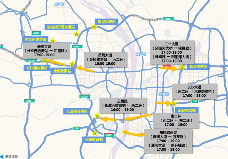 返程车流强度下降,高峰持续时间短。假期最后一天下午为返程车流高峰期,特别是16-19时为返程高峰。17时岳麓大道、三一大道、湘府路高架进城方向车路上升,19时长沙大道、云栖路进城车流增加,21时进城通道交通恢复正常。