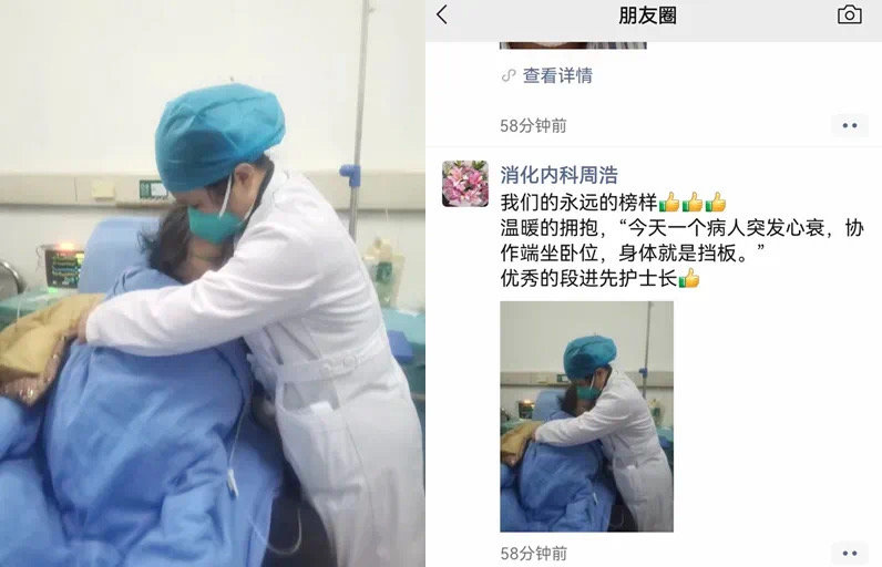 近日,长沙市中医医院(长沙市第八医院)东院一名医护人员发布的一条朋友圈令人感动,“温暖的拥抱,今天一个病人突发心衰,协作端坐卧位,身体就是挡板。”配图中一名医护人员将病人搂在怀里,用身体为其做支撑。
