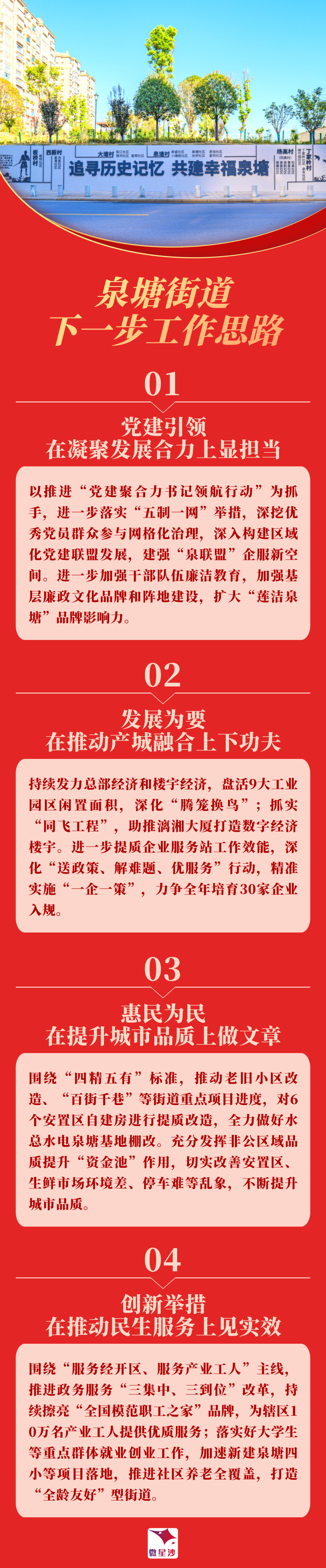 2023年,泉塘街道将全面贯彻落实党的二十大精神,按照县“两会”的部署安排,坚定不移推进“四个年”行动,围绕“服务园区提标,城市建管提质,社会治理提效”工作要求,不断强化“拼”的作风,树牢“敢”的导向,激扬“干”的劲头,交好“十张答卷”,为长沙县率先打造“三个高地”、全面建设中国式现代化先行区贡献泉塘力量。