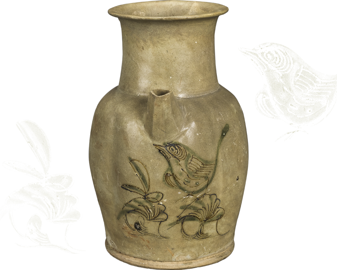 春天不只出现在视野里,当善于聆听的耳朵一经打开,春声悄然入耳。春日一来,飞鸟开始鸣唱、求偶,在地面上大摇大摆地走,在树林里纵情高歌,奏响春日的乐章。这件唐长沙窑青釉褐绿彩花鸟纹执壶上,小鸟立于花草之上,正抬头啼叫,鸟语花香的画面扑面而来。