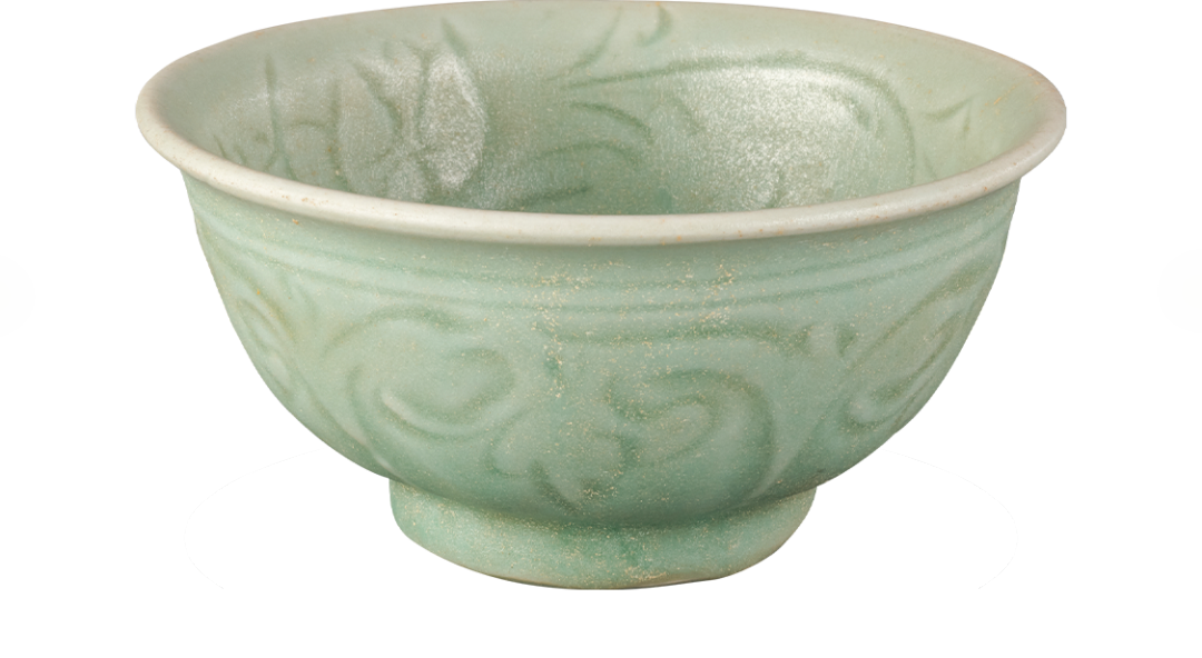 这只青瓷碗釉面光洁,如青玉般晶莹纯净,蕴含着春天般的细腻柔和之美。刻划在碗上的卷草纹流畅清晰,造型曲卷圆润,似春风细雨中抽芽的嫩草,展现着勃勃生机。