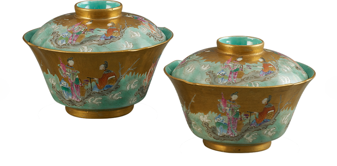 清 金地麻姑祝寿粉彩盖碗