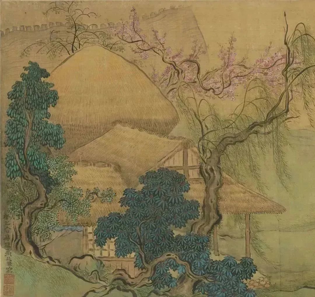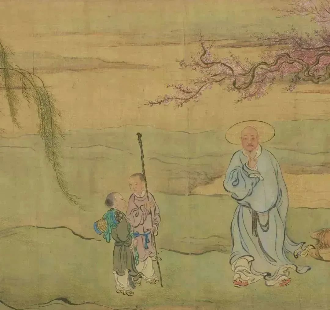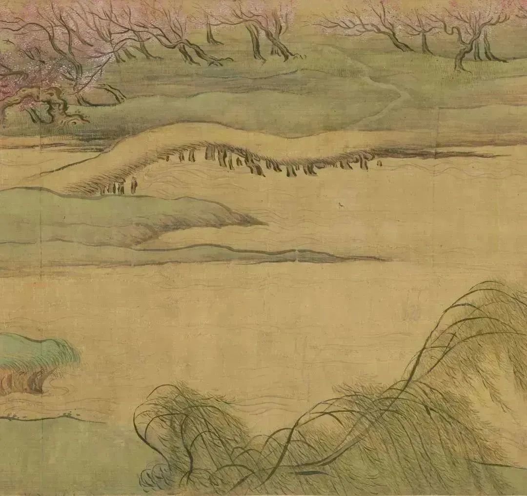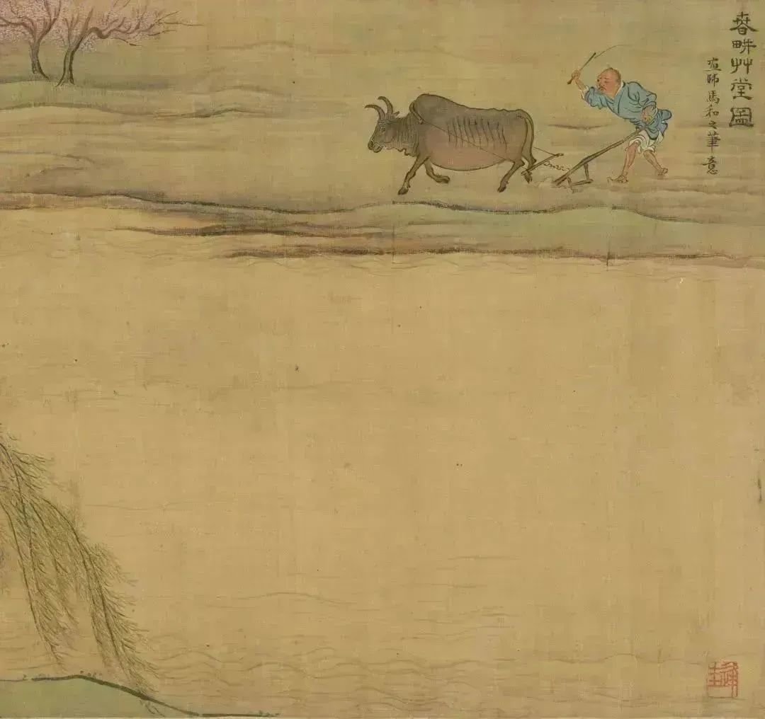 日长飞絮轻,春游正当时。到了郊外,桃红柳绿,春水潺潺。这幅《春耕草堂图》中,桃花林前,农夫正在田野中赶牛耕作,忙于农事。柳荫树下,头戴草帽的老翁右手拈须,若有所思,身旁两位稚气未脱的孩童一人持杖,一人背负书卷。一派春意盎然的耕读场景由此铺开,召唤人们出门春游。走吧,出门春游去,在自然中与春天相遇,领略春趣。
