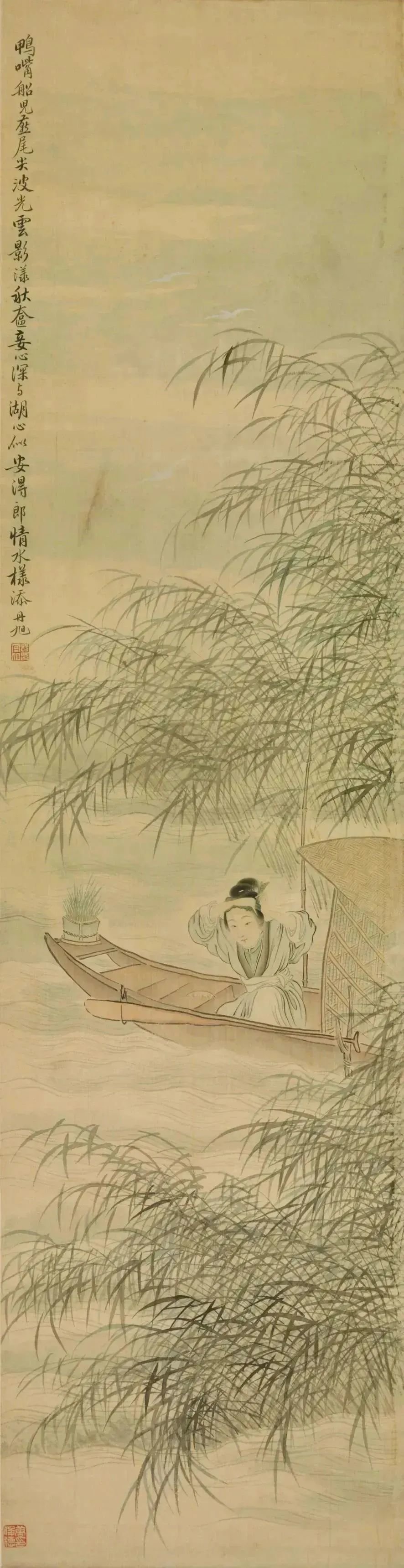 在明媚绚烂的春日,邂逅画中伊人。她俊眉修眼,身着翠绿的衣衫,正泛舟碧波粼粼的水面上,在摇弋的簇簇芦苇中梳理头饰。笔致轻灵淡雅,颇得古代丽人温婉仪静的生动神态,不仅表现出人之美,也展现了叶之柔、水之悠,描绘了一派旖旎雅致的春日风光。