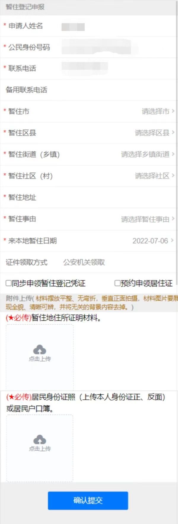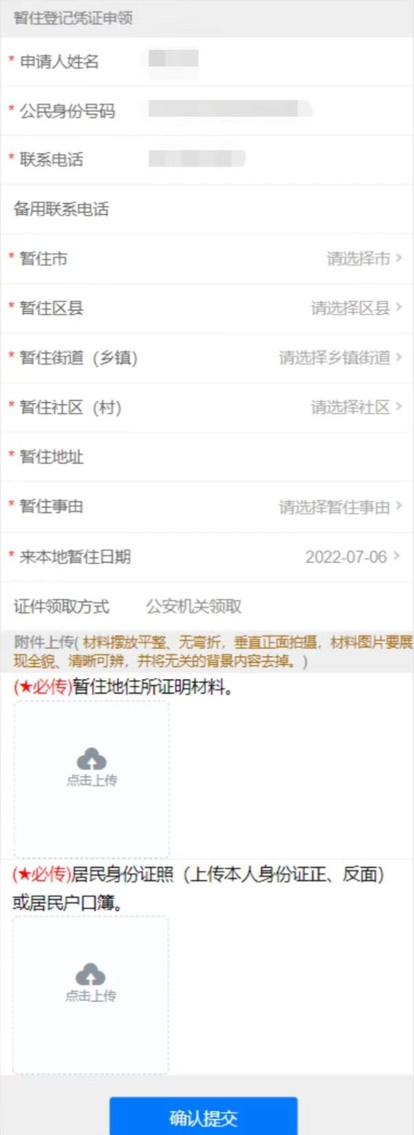 三、需要申领暂住登记凭证的,进入“暂住登记凭证申领”模块,依照页面提示填写有关信息、拍照上传证明材料,提交办件申请(如下图)。
