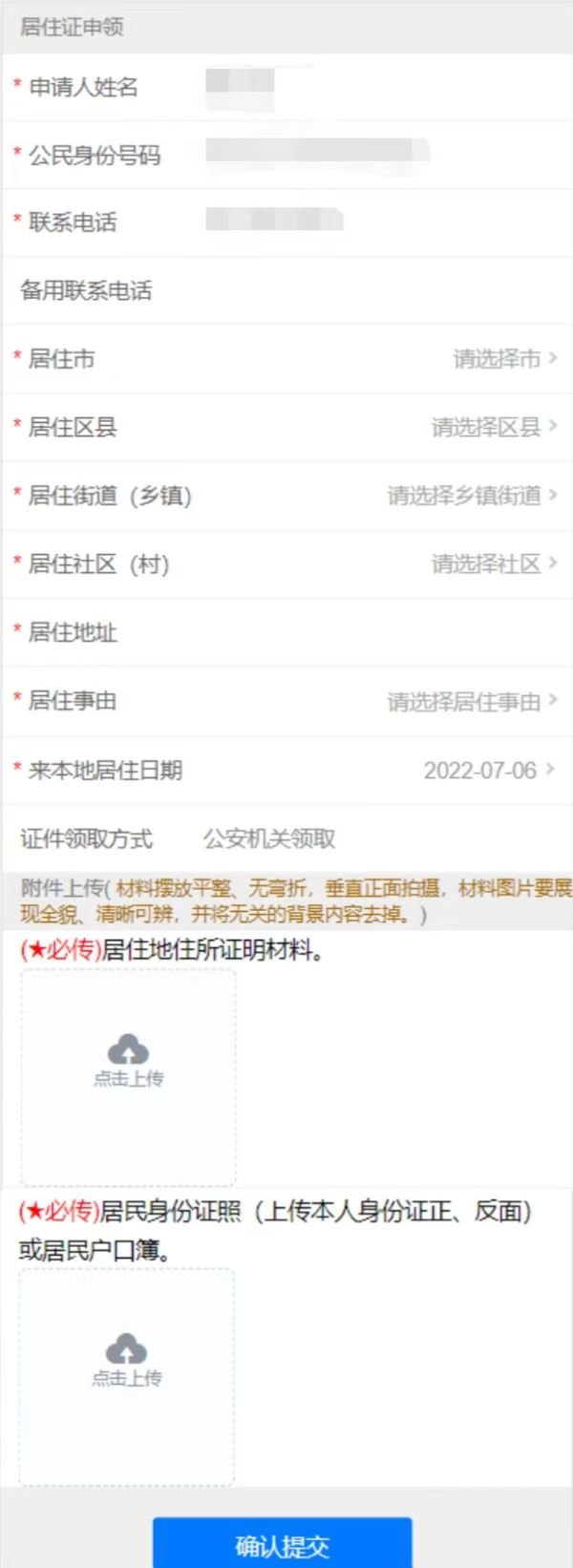 四、需要申领居住证的,进入“居住证申领”模块,依照页面提示填写有关信息、拍照上传证明材料,提交办件申请(如下图)。