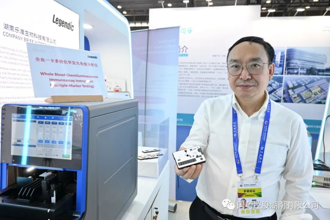 一滴血、15分钟,一张“卡片”能同时做6个化学发光全流程项目,湖南乐准生物科技有限公司展台上十分具有科技感的一张张卡片吸引了大家的眼球。乐准生物总裁邬鹏程介绍,更精准、更高效、更低成本始终是体外诊断领域发展的主旋律。这次在展厅展出的这款一卡多检化学发光免疫分析仪,使用乐准研发的拥有多项专利技术的生物芯片,可以在普通环境下快捷完成全血化学发光全流程项目,目前在国内外都是领先的。