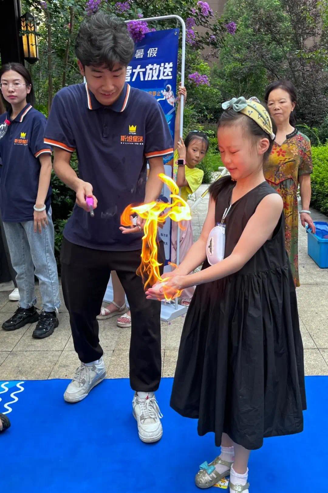 “哇,好神奇呀,妈妈,快看看我的烈火掌,是不是超级厉害呀!”7月26日,岳麓区中建梅溪湖中心小区的广场上,不时传来孩子们的惊呼与笑声。中建物业正在举办暑期童心计划系列活动之走近科学。现场特别邀请了“斯坦星球”的老师,带领小区近百名孩子们体验科学小实验的奥妙。活动现场,身着太空服的工作人员与小朋友们热情互动,介绍太空服的作用与功能。孩子们认真观看“原子氮”带来的蘑菇云效果,还有“干冰秀”带来的感觉。最引人入胜的是“烈火掌”的魔幻表演,现场小朋友们纷纷加入其中,一起感受烈火在指间的跳动,好奇手部的安然无恙。