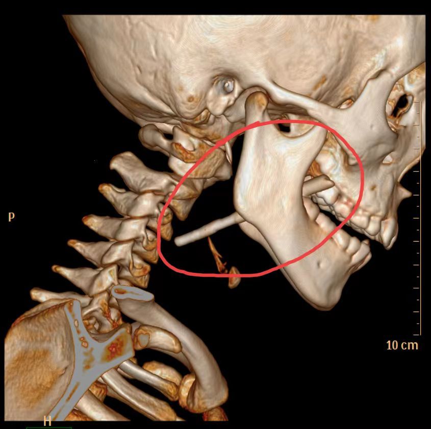 为了确保手术中的安全,医师给阳阳做了CT检查,发现一条状(筷子样)致密影经右侧下颌骨后方达左侧咽喉部后方(咽后壁),左侧咽后部局部软组织有肿胀,咽后壁及气管/食管周围软组织内可见多发气体密度影、下方达上纵隔(主动脉弓上方水平)。耳鼻咽喉头颈外科医师在急诊全麻及气管插管下为孩子实施了咽部异物取出术+咽部清创术,术中取出筷子残端,长约9.3cm。