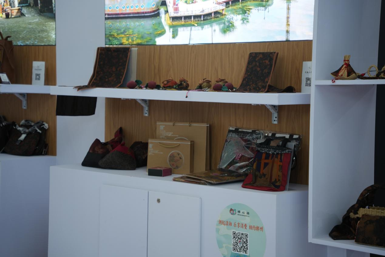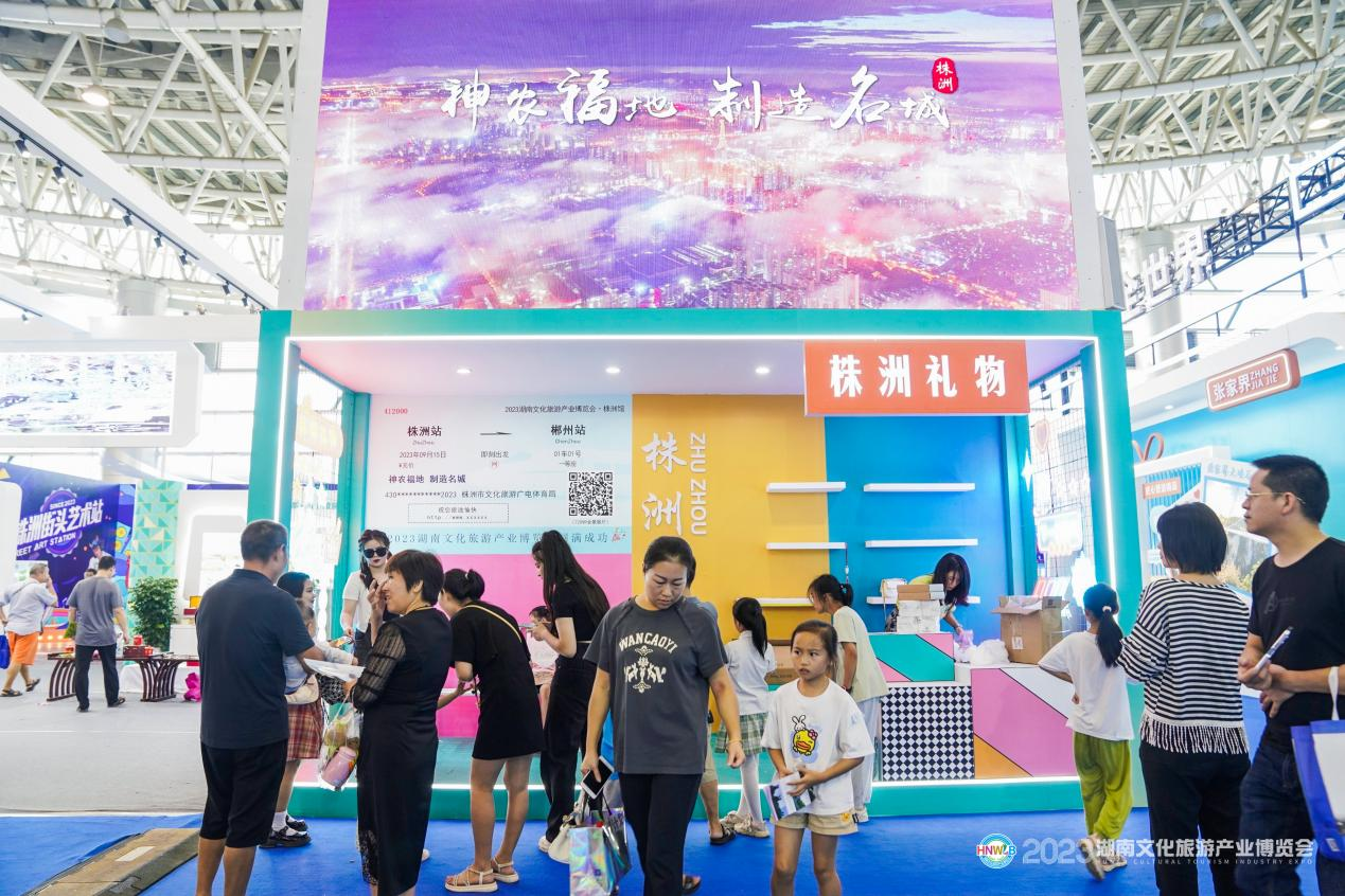 在株洲馆展览场地,一股潮玩气息铺面而来。本次株洲馆有五大展示板块,分别为中华始祖炎帝、千年瓷都·天下醴陵、世界制造名城、第一红色根据地、互动体验区("版画体验”五彩株洲、厂BA、街头艺术站打卡)。展馆有多个出入通道,采用半开放式,方便游客对株洲旅游特色产品的游阅,通过这些,观众可以看到株洲市特色文化旅游产业融合发展的优秀成果。