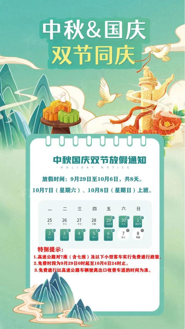 2023 年中秋、国庆假期紧邻,放假时间为 2023 年 9 月 29 日至 10 月 6 日,共计八天时间。高速公路对 7 座以下(含 7 座)小型客车免费通行政策。